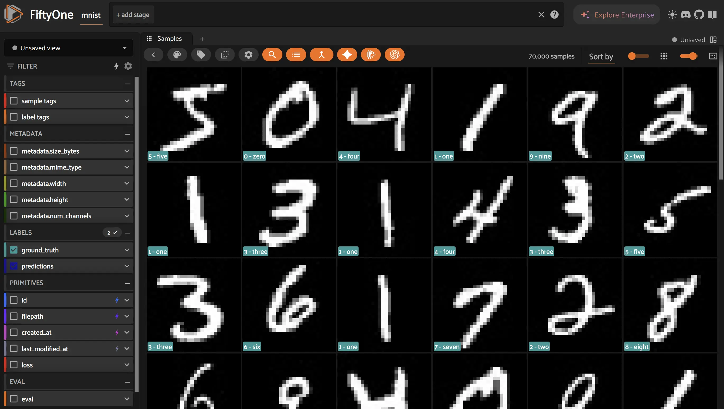 Train a simple PyTorch model on the MNIST dataset using `FiftyOneTorchDataset`, with train/validation/test splits managed in FiftyOne and a reusable training script.
